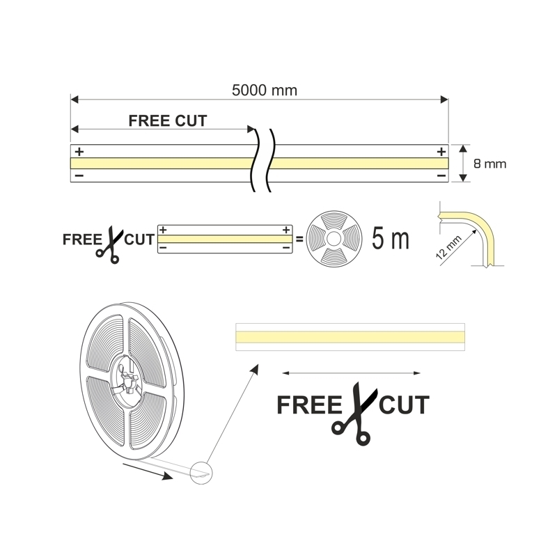 LED trak COB 5m 12V 13,4W/m 1180lm 6000K IP20 DL FREE CUT 8mm/free cut CRI>90 (0,5m=6,7W/590lm)