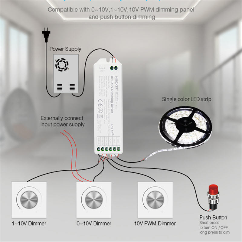Uporablja se za nadzor in regulacijo svetilnosti z 0-10V, 1-10V, 10V PWM. Omogoča nastavitev minimalne svetlosti. Podpira 2.4G daljinske upravljalnike, nadzorna razdalja do 30m. En daljinski upravljalnik lahko nadzoruje več LED trakov hkrati. Omogoča tudi "Push dimming" zatemnitev na dotik, zatemnitev s pritiskom na tipkalo.Model: 40037